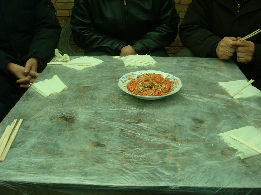 好了,终天能坐下来吃饭了,大家也看到了,现在农村里过事也像饭店里一样用一次桌布和一次性筷子,因为会造成白色污染,所以现在很多地方已经不再有这些了,但农村里为了方便还是在使用。