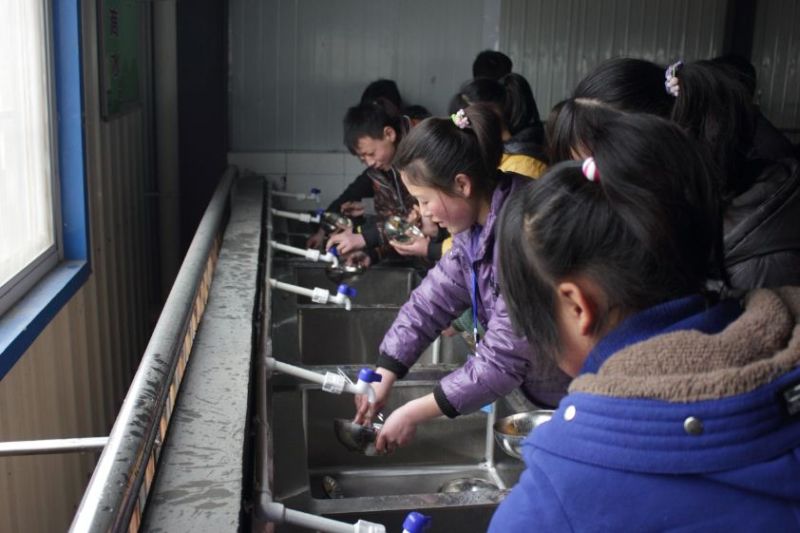 我们吃完饭后,都会把餐具拿到水龙头处认真清洗,同学们呢都遵守学校的规章制度认真清洗自己的餐具。