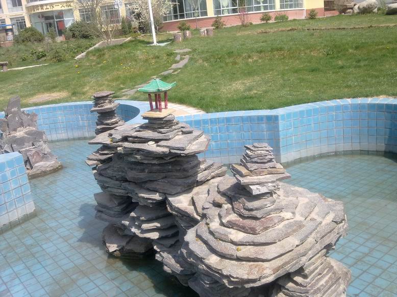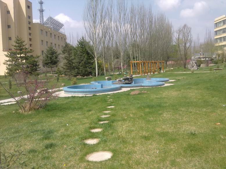 芳草如茵的草地中间,有一块圆形的水池,通往水池的小路,是几块圆形水泥板,只见这几块水泥板深深镶嵌在草地上,早已和草地融为一体,如同草地里长出的几块小蘑菇。走过这几个小蘑菇,蓝色的水池如同两个圆环,让人都不忍心离去。
