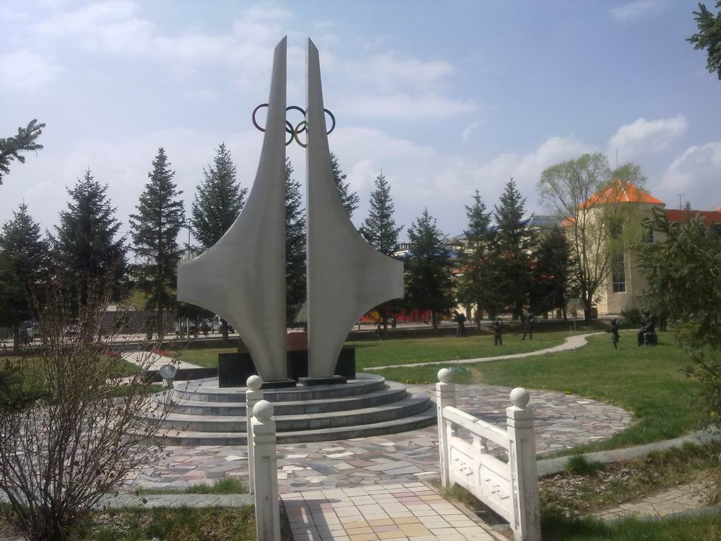 水池的旁边,是一个标志形建筑,那是一块用碎的大理石地板铺起来的圆形的场地,上面不同颜色的大理石如同镶嵌的大花,中间四个台阶,台阶正中间是两个尖形的标志物,上面有五个圆环:奥林匹克的标志。