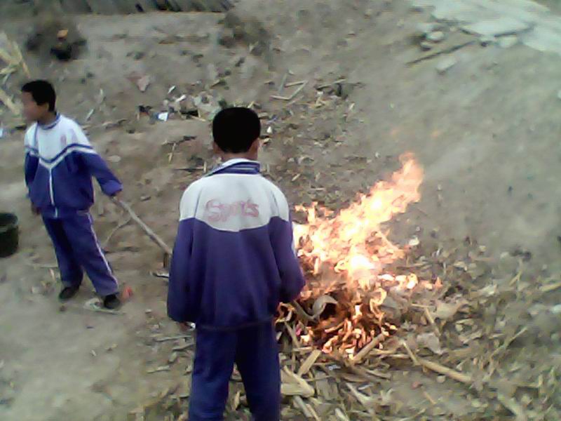 再看第三小组的,干得也蛮起劲的。杨聪拿着扫帚,认真地把垃圾扫成一堆,董航天同学从班长手中接过火种,把堆在一起的垃圾点燃,顷刻之间燃起了熊熊大火,甚是壮观。