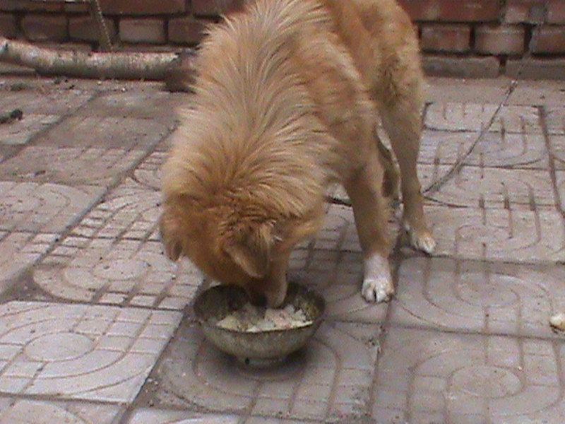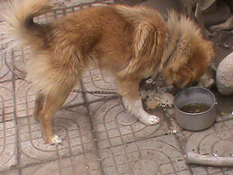 听爸爸说:"虎虎"离开妈妈才两个月,它最爱吃骨头。吃的时候,用两只前爪子紧紧地把骨头按在地上。你看它嚼着骨头,吃的多香啊!它一边吃一边不停地摇着尾巴,,像在感谢主人给它美餐。它很喜欢我,我走到哪,它都爱跟着。它对我生气时也怪厉害的,"汪汪"叫个不停,还咬我脚后跟呢!