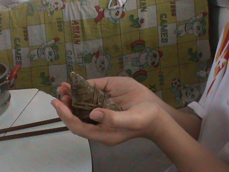 中午,我们全家坐在一起吃饭,奶奶把已经煮好的粽子端上来,我们一人夹了一个,看看粽叶里面是什么米的。我吃了一个肉粽子。妈妈说我是幸运的,因为只有两个肉粽子,我已经吃了一个,所以在这些粽子里还有一个。