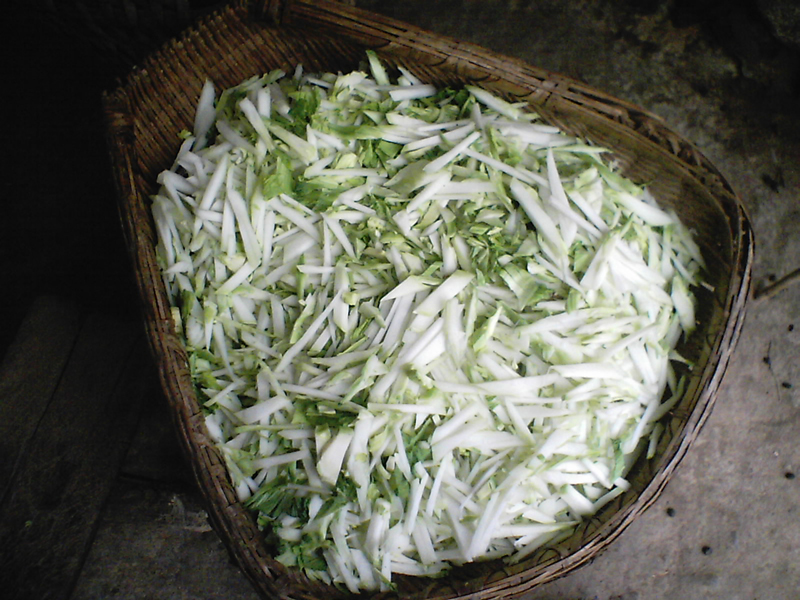 叶子剃了以后,就是把剩余的主干切成很细的小方条。然后再用水冲洗干净。