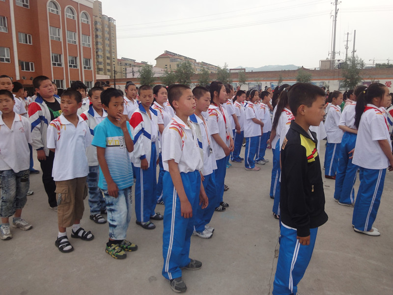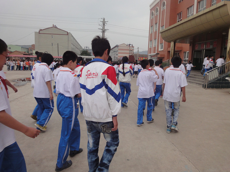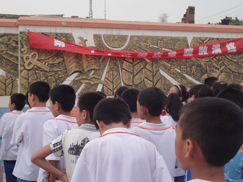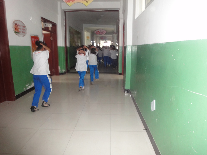 今天下午第二节课上课以后,数学老师和语文老师都来到了班里。老师说:"警报响了,同学们就钻到桌子下面,双手抱住头"。警报响了,我们都藏在桌子底下,警报停了,我们就从教室跑出去,我们前四排是从前门出去的,后四排是从后门出去的。出去以后,我们马上站好了队,接着校长上主席台讲了一段精彩的话。