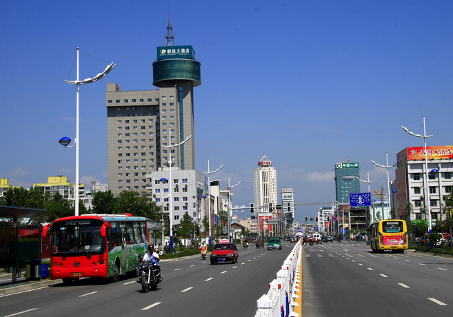 从北面进入汉中盆地,宽阔笔直的柏油马路取代了以前的土路。天汉大道的北面是经济开发区,路两旁建起了一栋栋高楼大厦,商铺装修的灯光辉煌,两旁的绿化带五彩缤纷,绿叶葱葱的香樟树和活化石水杉树还有那竞相开放的鲜花,把天汉大道装点的更加美丽。天汉大道宽阔的马路上车潮如流,各种各样的车辆往来穿梭着,像一条彩色的河流在流动。天汉大道从汉江大桥起步到石马立交桥,全长1456.75米.来到天汉大道中段,道路两旁以前的土平房已被高楼大厦取而代之了抬起头来看国贸大厦鹤立鸡群地耸立城市中心,它已成为汉中的标志了。国贸大厦就像一个高大无比的长方体,在阳光照耀下,十分耀眼,十分壮丽.近看,国贸大厦直插云宵,好雄伟,好高大啊!其造型是那么别致,那么美观,你一定会被吸引,站在国贸大厦旁边,你会感到你自己是那么的渺小……