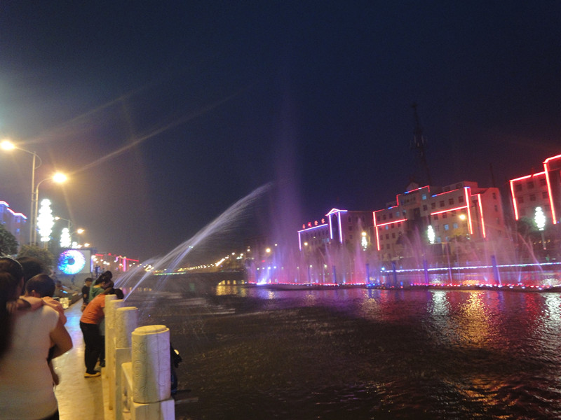 汤泉河的夜景还很美丽,灯光照在水面上,五颜六色,好看极了。中央还有几个喷头,把清澈的泉水喷向天空之中,水洒落在陆地上,观赏的人都认为下雨了,急忙躲到了别的地方。