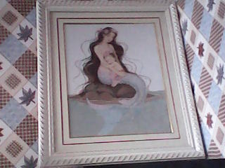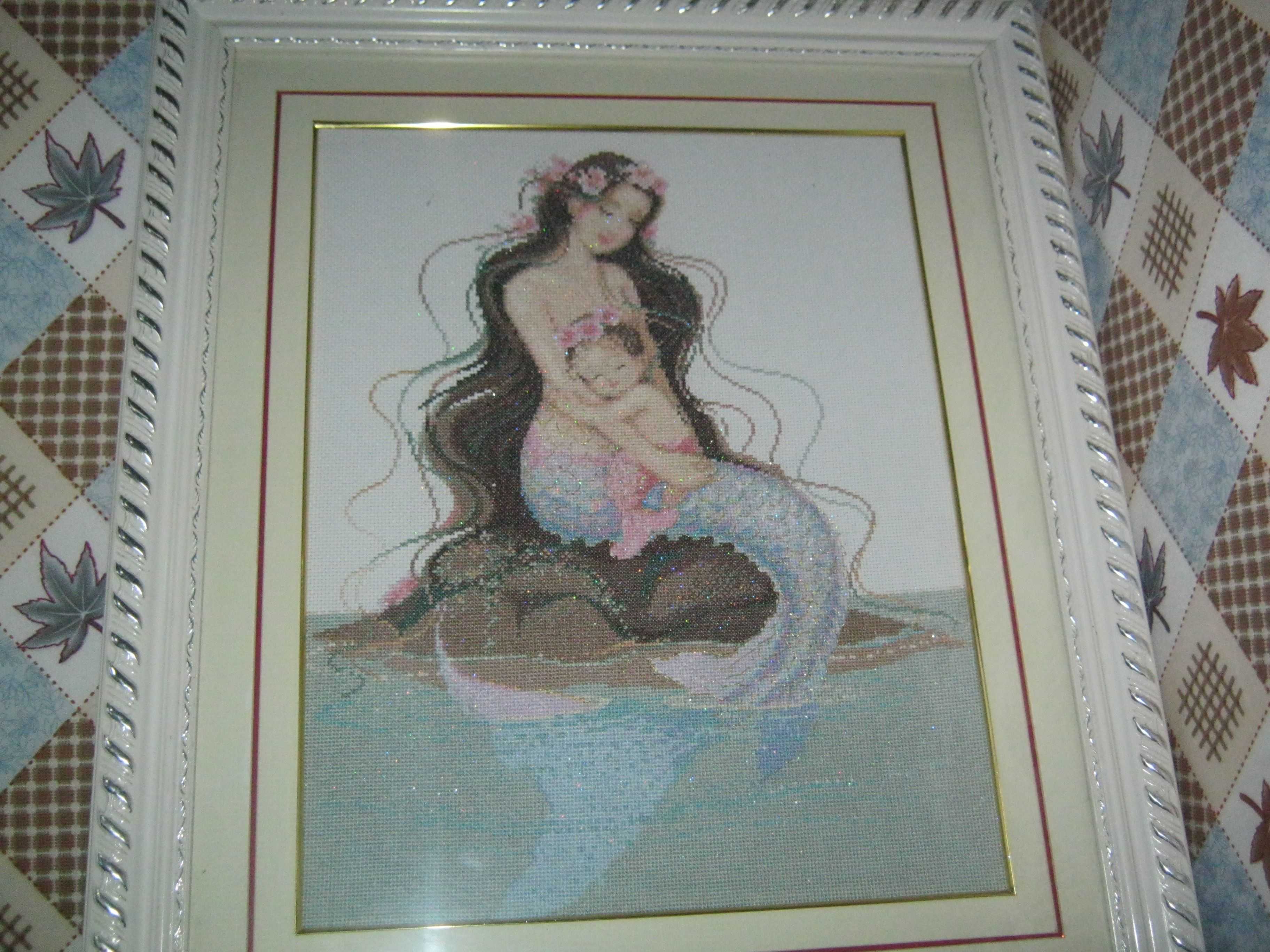 另一个是美人鱼刺绣,它有一个白色的边框,美人鱼妈妈抱着小美人鱼,小美人鱼在妈妈的怀里安静的睡着,很可爱。它们坐在石头上,石头周围是大海,情意浓浓,令人向往,母子情深,令人感动。