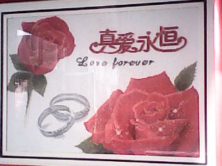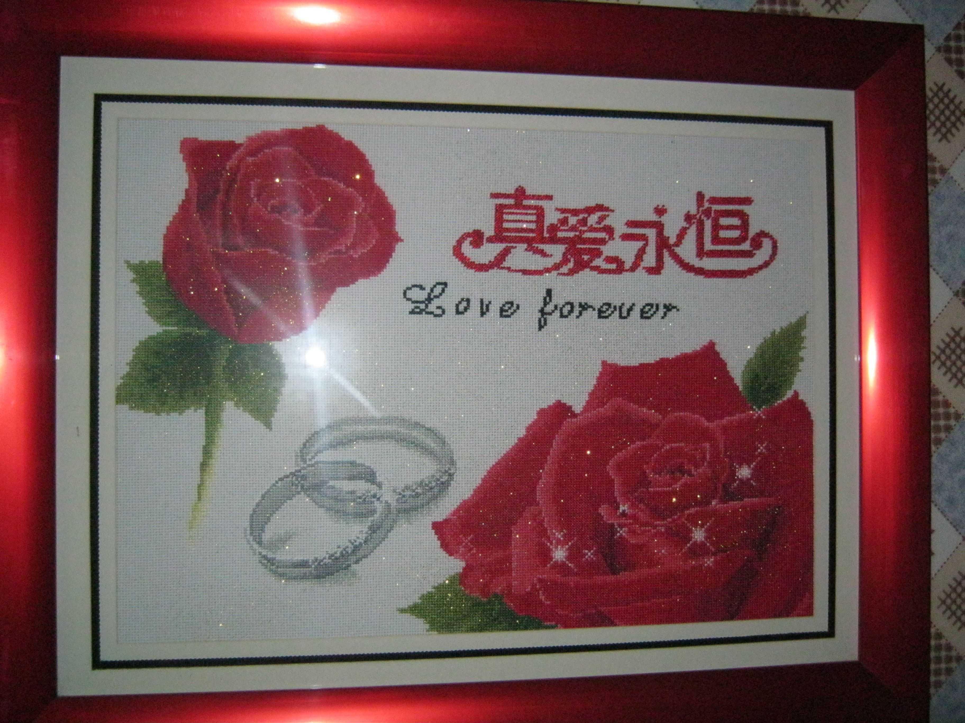妈妈已经绣了很多,可是大多都送给了别人,家里只留下了三副。我先介绍最大的一副,它有一个非常大的红边框,两朵非常鲜艳的红玫瑰盛开在里面,中间有四个大字"真爱永恒",下面还绣着英文和两个银色的手镯,非常漂亮。