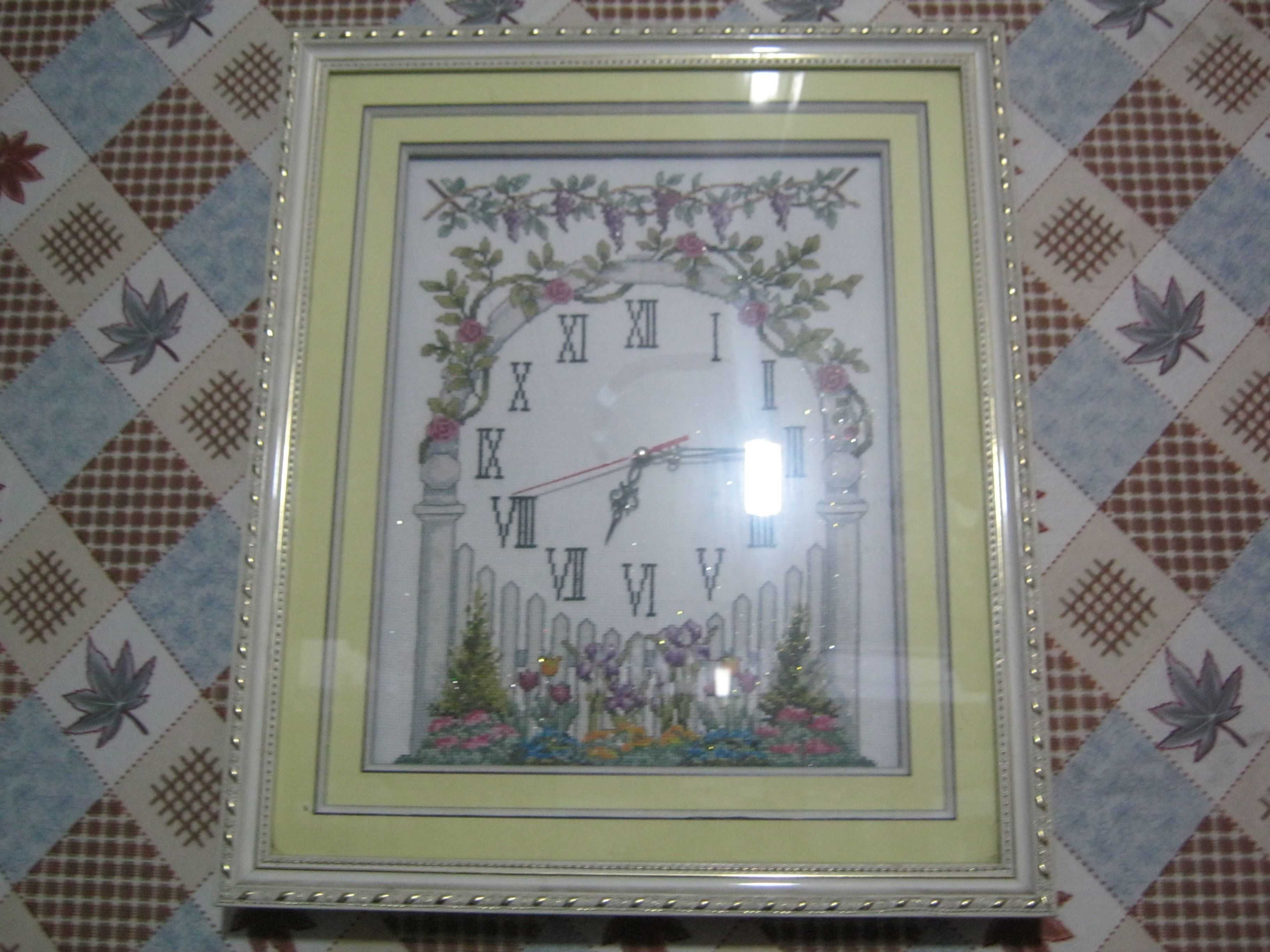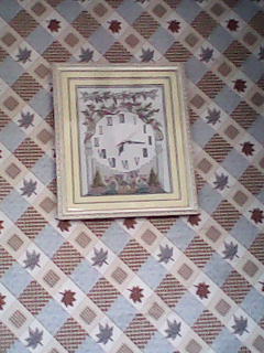 第三个是刺绣不仅是一副淡雅的图画,而且是一个钟表,最上面是六串葡萄挂在藤蔓上,下面有一个圆形,被花围着,再下面有两棵树和几朵花,中间是钟面,上面标着:"Ⅰ、Ⅱ、Ⅲ、Ⅳ、Ⅴ、Ⅵ、Ⅶ、Ⅷ、Ⅸ、Ⅹ、Ⅺ、Ⅻ",老师告诉我,这是罗马数字的1到12,这副十字绣镶在白色的镜框里面,每天我都用它来看时间。