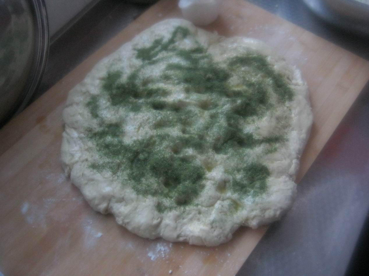 妈妈把碱面和干面粉加到里面,又揉起来,揉的差不多了,就把面团放到面板上擀成一个面饼,上面抹了一层清油,上面还撒了一层香豆,闻起来一股青草的香味。