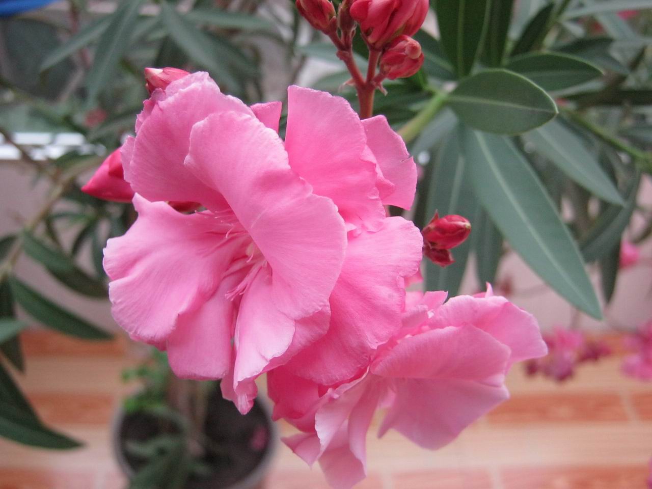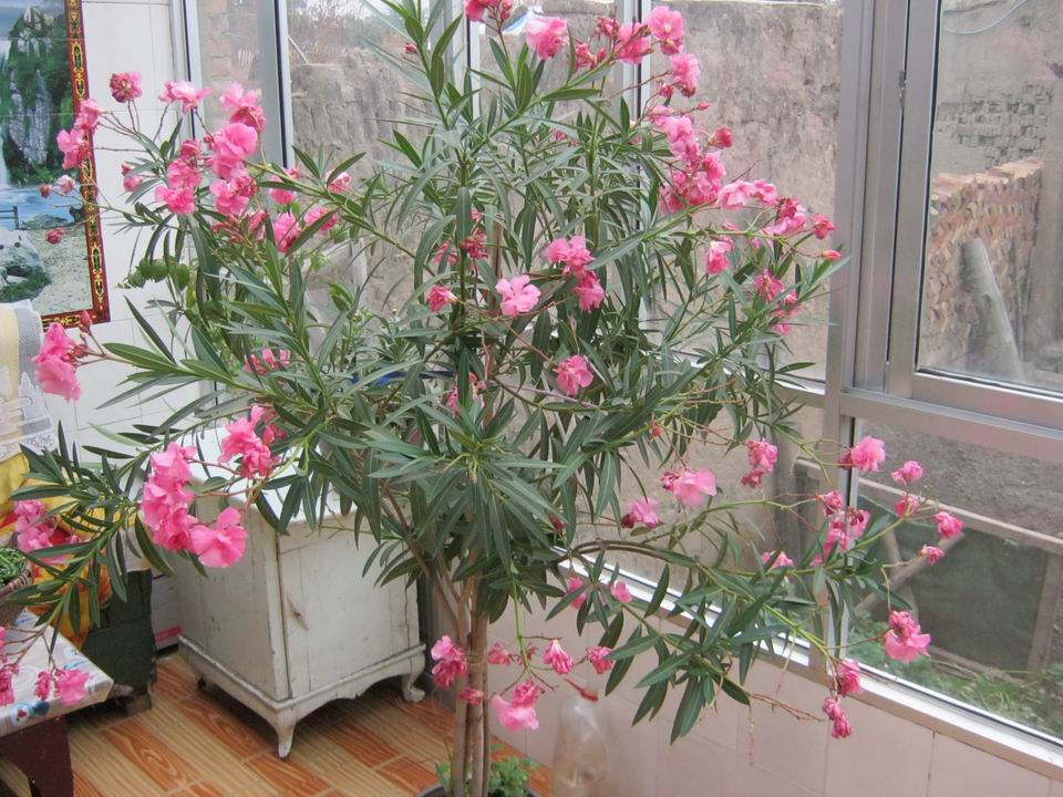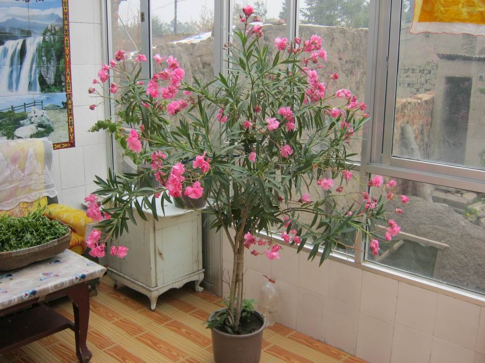 奶奶家有一盆的花,叫夹竹桃。它长得很高大,有一人多高,和其他的花比起来,简直就是花中的巨人了,茂盛的枝叶间开满了粉红色的花。