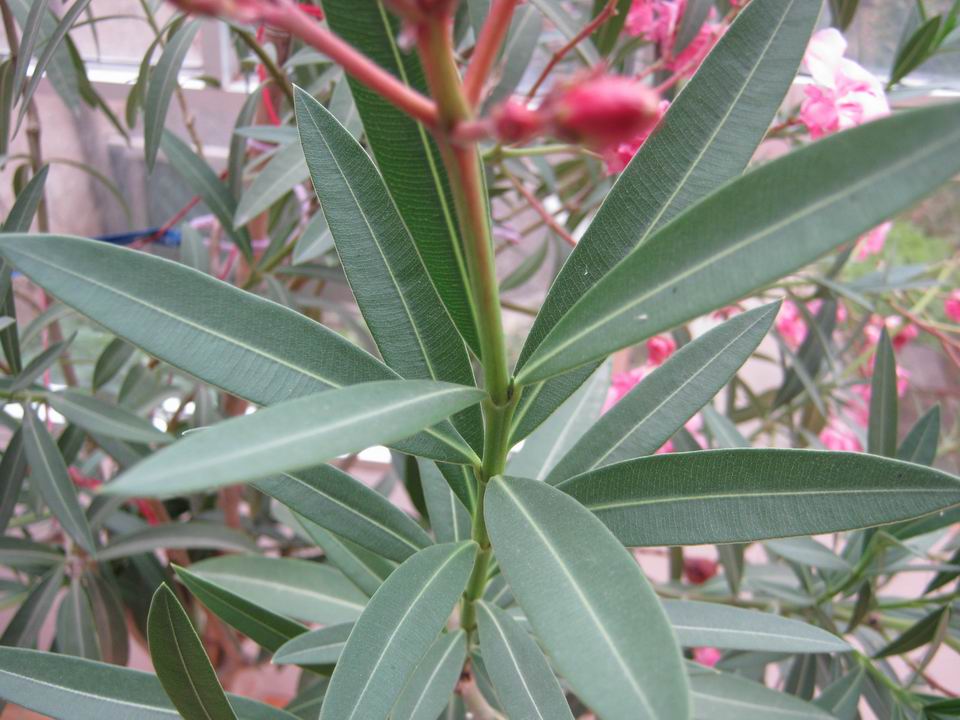 夹竹桃的叶子是长条形的,厚墩墩的,形状有些像我们夏天常吃的蜜桃的叶子,我想这也是为什么把它叫做"夹竹桃"的原因吧。
