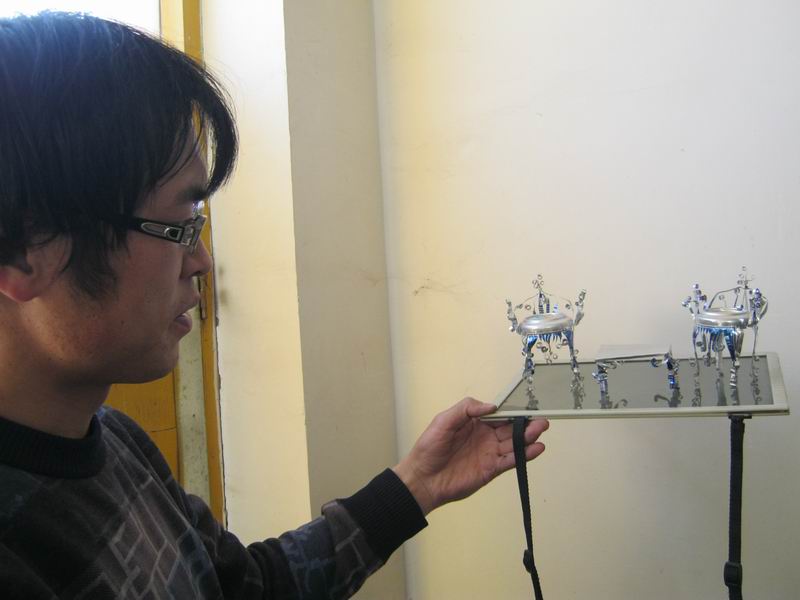 在他的手里,生活中的各种废旧物品都可制作成精美的手工艺品,变废为宝,化腐朽为神。一些小制作既逼真又美观。废弃的易拉罐会雕刻成典雅的小茶几,旧玩具可做成航天飞机模型......他指导的学生的科技小制作还获得市级环保奖呢!