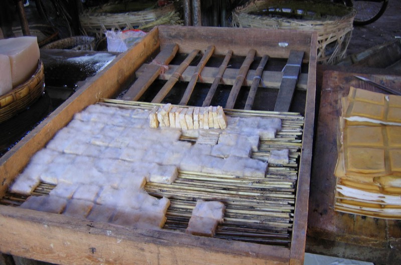 2.将豆腐块分别排列入箕发酵,温度在20摄氏度,经过一周时间,即可长白而绿的菌毛。