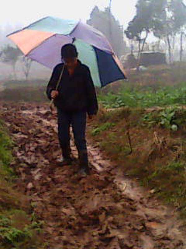 一看图片,不言而喻,这是一条泥泞小道,受天气影响,此小道为当地农民带来了不少交通问题。下雨天,这条小道泥泞不堪,使人寸步难行;天晴时,小道上出现了坚硬的小泥坑,走在上面,让人疼痛甚矣!