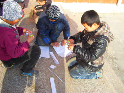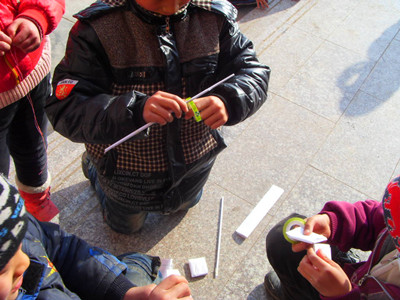 最容易的就是卷枪筒了,只见刘小朋用了一张大纸,沿着纸角快速的卷了起来,可是怎么也卷不紧。他想了办法,给纸沾了点水,结果把纸给搓破了,只好重新再来。经过几次实验,最终结结实实的卷了一根枪筒。看来卷好枪筒也不是一件容易的事。