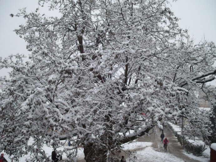 刚进校园就可以看见一颗大槐树他的身上被覆盖了一层白白的雪,好像穿上了一件白色的大皮袄,好像站在哪里不知道在眺望着什么;柳树上好像也披上了一件白色的大衣 ,在那里矗立着,守护着我们的校园,这一切给人的感觉是那么安静,给校园添加了一些美丽。