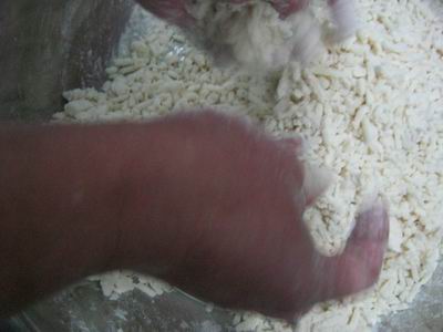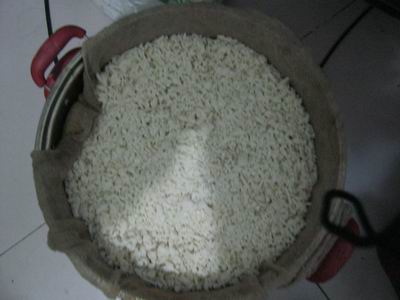 二、蒸。把笼布或纱布用水洗干净,稍稍挤挤水,铺在笼屉上,把拌好的白面块垒均匀地撒在上面,放在开水锅上蒸,蒸熟后出锅。