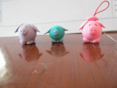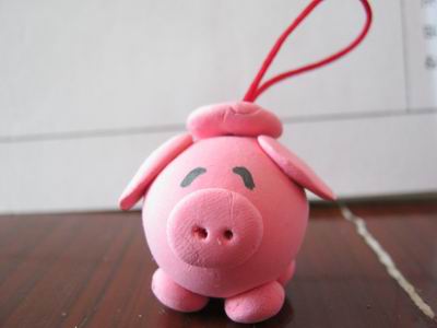 姐姐送我一盒奇特的泥,有粉色的,红色的,绿色的……五颜六色,异彩纷呈。我看着就蠢蠢欲动,想一展身手。我抓起我最爱的粉泥,捏个什么呢?对,捏只胖胖的小猪。我揪下一块泥放在手里搓啊搓,搓成一个圆球,来做胖胖的猪身子,又捏了四个大小一样的扁圆球粘在猪身子的下面当猪脚。拍了个小圆饼,还在上面扎了两个圆孔做猪鼻子,捏了两扇桃形的猪耳朵,再给它画上两只弯弯的眼睛,一只可爱的小猪闪亮出炉了。我用一块扁圆形的泥粘在上面,弄了个红线绳,一个漂亮的小猪挂饰就这样诞生了。