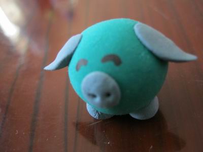 我想:一只小猪也太寂寞了,这只漂亮的粉色小猪当猪妈妈吧,于是我又拿出绿色和蓝色的泥捏了一只猪爸爸,猪爸爸绿色的身体,蓝色的耳朵、嘴巴和脚,真是帅气。