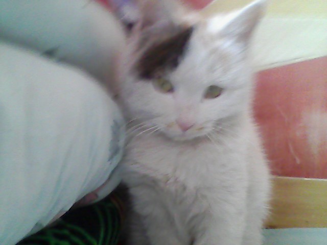 我家有只活泼可爱的小猫,它浑身雪白,尾巴却是灰褐色的,就像是特意按上去的,,就像一团银白色的雪球在地上滚来滚去。小猫的脑袋圆圆的,竖着一对尖尖的小耳朵,那圆圆的眼睛,白天总是眯成一条缝,可是到了夜里就变成了两颗耀眼的宝石,发出幽幽的蓝光。
