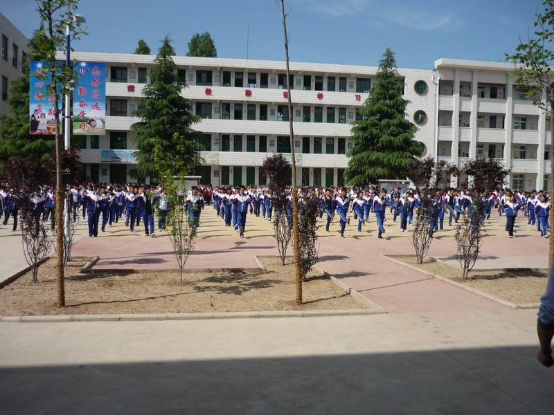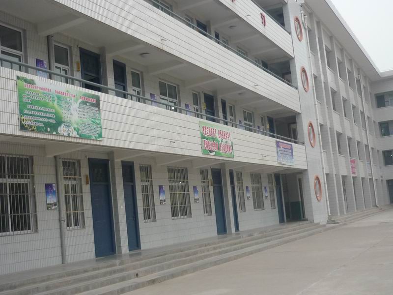 走进滑动的校门,正眼看过去,你会看见一幢橙黄色的建筑,那是老师的办公楼。接着转向北方,那幢白色的楼层是我们的教室。接着向后转,两幢并排的四层楼伫立在眼前,那靠近老师办公楼的那幢楼是女生公寓楼,靠着右手这边的是男生公寓楼。沿着两幢楼之间的一条小路走到后面的院子,厨房、商店并排直立,都向你敞开着门。让你忍不住进去吃一顿的想法。在女生公寓楼的后面是锅炉房,我们在那儿打水,后面在各有一定的空隙边就是厕所,也就是同学们说的wc了,厕所前是篮球运动场地,厨房前也就是乒乓球的运动场地。下课后或午饭后那儿是同学们的快乐天地了。