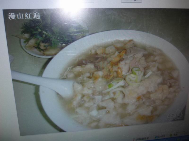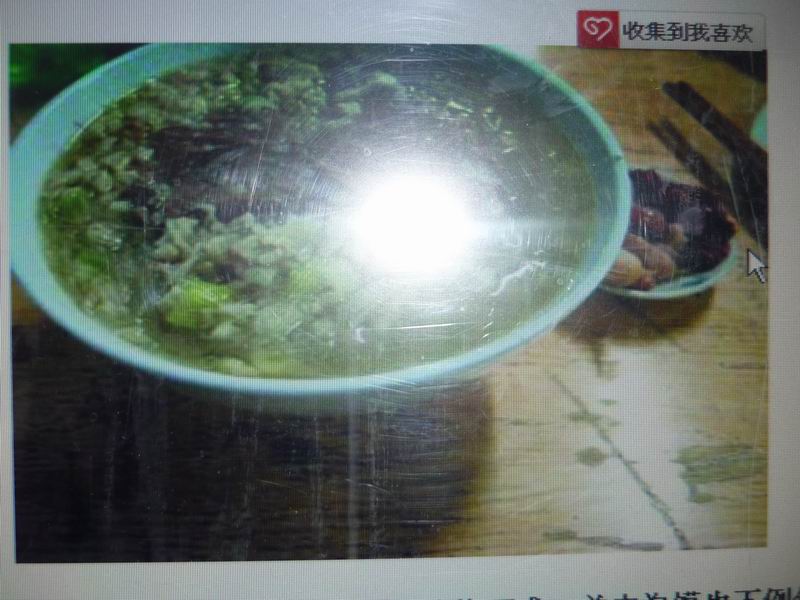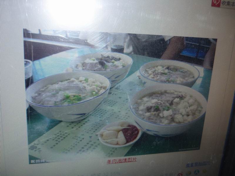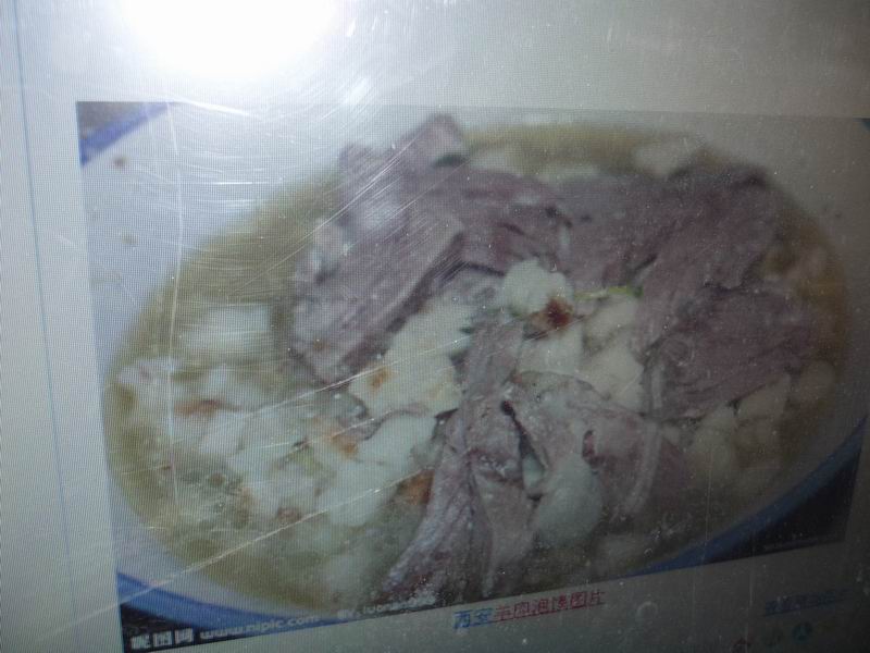 羊肉泡馍是一次偶然机会吃到的。现在想来还是垂涎三尺,我记得羊肉泡馍是这样做的。首先将瓣开的模块放入羊肉汤里,再将各种喂料放入就完成了。做好的羊肉泡馍端上桌。只见金黄的肉汤,银白的粉条,鲜红的辣椒,我已不能用言语形容了。再加上四四方法的肉片,吃到嘴中,肉汁淳厚,汤鲜美无比,吃了个碗底朝天,却很意犹未尽。我非常喜欢吃它。