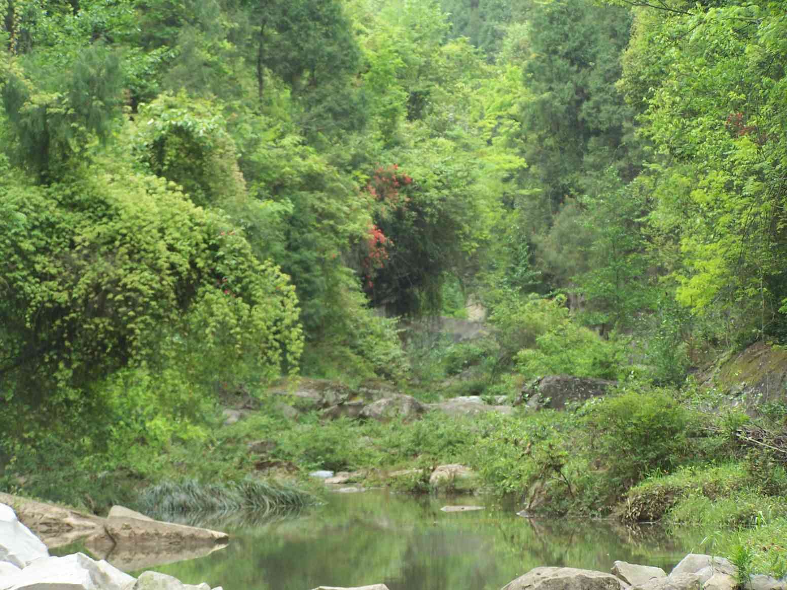 在峡谷中有一条小河,终年的流着,潺潺的流水声和树林里的鸟叫合成一曲动听的奏鸣曲两岸的绿叶把河水染成了绿色,把河边的水草也染绿了,整个构成一幅和谐的画面。