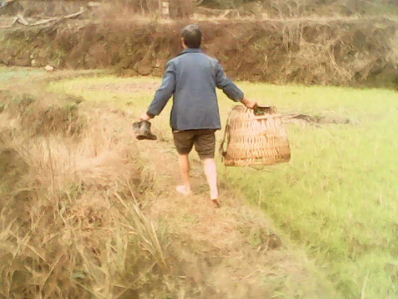 已经快到正午,人家屋顶上炊烟缭缭,肉香弥漫。爸爸找来破了底的背篓,挽起裤脚,脱下鞋子,下田去了。一月份的天气很寒冷,爸爸在田里走来走去,不时用背篓扣住鱼儿们,溅起的池水洒在爸爸衣服上。我在田埂上等待,只有埋怨鱼儿太机灵了,爸爸捉了很久也没有收获。母亲怕爸爸感冒了,说:"抓不住就算了吧。"但爸爸一脸执着。