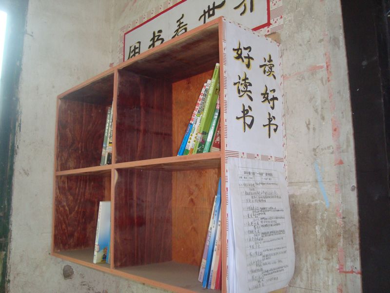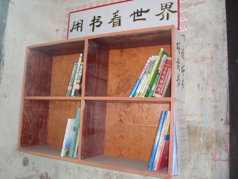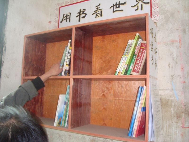 它安静的在墙壁上伏着,这个图书角有四个大格子,每个格子大概长30厘米高25厘米。它是有几块木板拼在一起的,虽然它不算漂亮,却很实用。