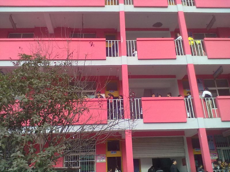 穿过操场,教学楼的体型就清晰地呈现在眼前,东教学楼的颜色是淡黄的,西教学楼的颜色是粉红的,这可真有特色。每栋教学楼前面都有几个花园,花园里的花草树木都争着生长,一片生机勃勃。