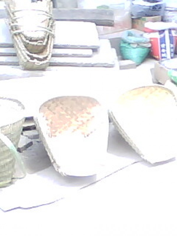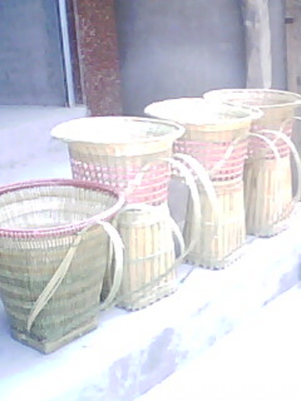 看见这种背篓了吗?它的形状与别的背篓不同,它是用来背小孩的.它的造型设计还可以吧,这种背篓虽小,但编起来却很费神费力,编一个这样的背篓,一般要花七.八 个时辰,像其他背东西的一样,背篓也要花上四五个时辰才能完工.