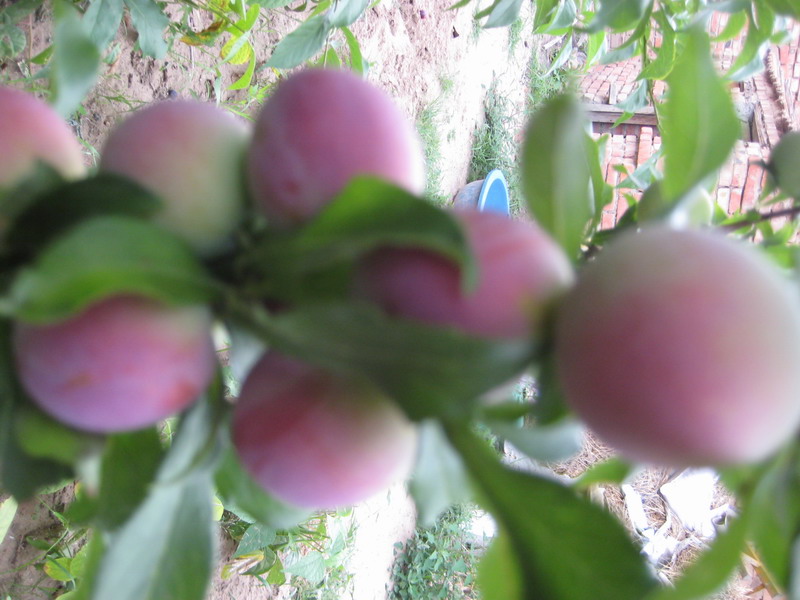 花坛的两边,有两颗李子树,它们好像是两个守护花坛的卫兵。每当中秋8月,它们的枝头就会持满了一个个沉甸甸的果实。这些李子有的略显棱角,有的像个大玻璃球,熟透的李子远远望中,像一个哈哈小的孩子脸,好像在向人们传送丰收的喜悦。