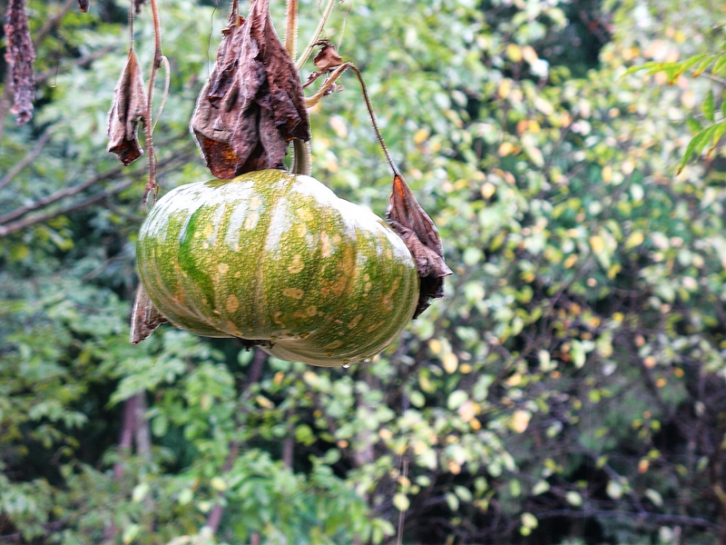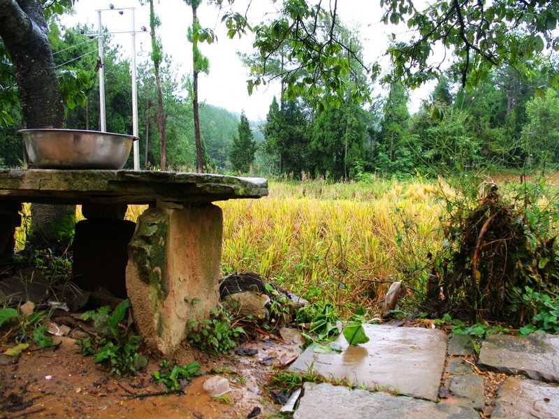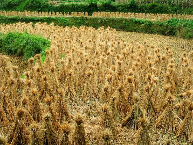 在大山中,春季的播种和夏季的灌溉获得了一坡好稻谷,农民们脸上挂满了笑容。田里的草垛子正在诉说着它的喜悦。田边的树梢上,一个南瓜正翘盼农民的来收获。