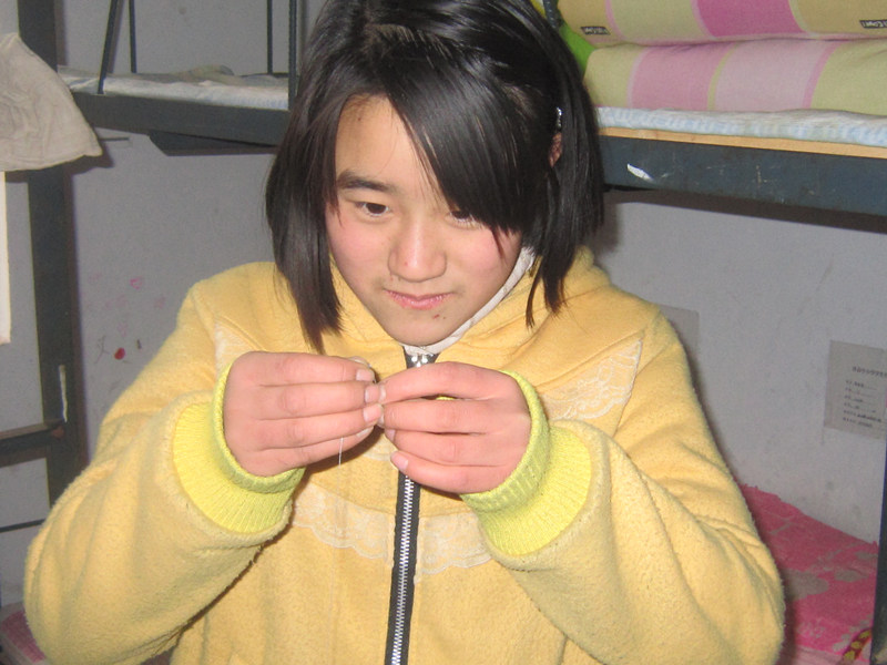 我们同一个宿舍的同学借了一枚针和一小捆线,首先,在比较亮的地方把线穿入针孔里边,然后,就把线的两个尾巴对齐,再挽一个疙瘩,以防止线从针孔里跑出来。最后,我就开始一针一线的缝了起来,在我很小的时候,妈妈就教过我怎样缝衣服,所以现在缝起来不是太困难,几分钟就完成了。