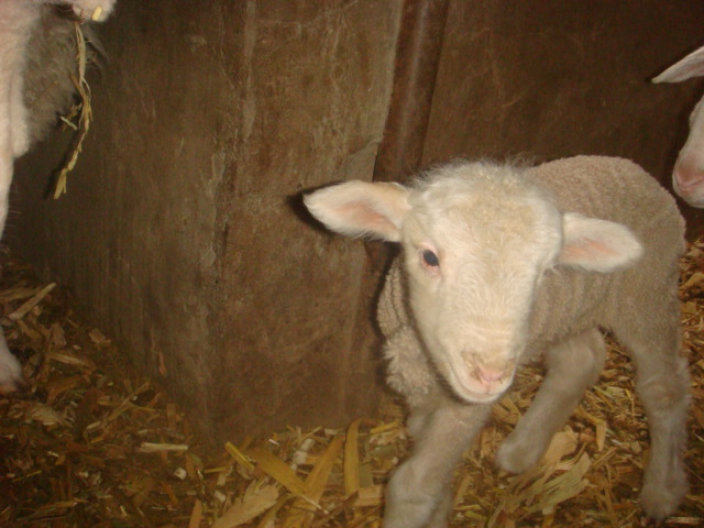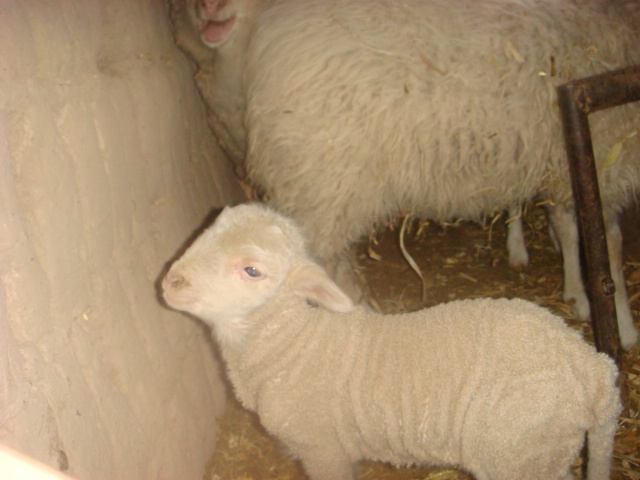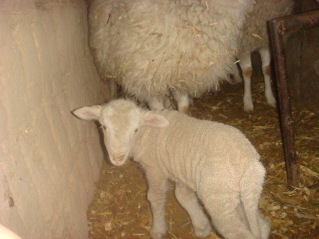 我家有几只羊。其中的一只大母羊生下了一只可爱的小羊羔。