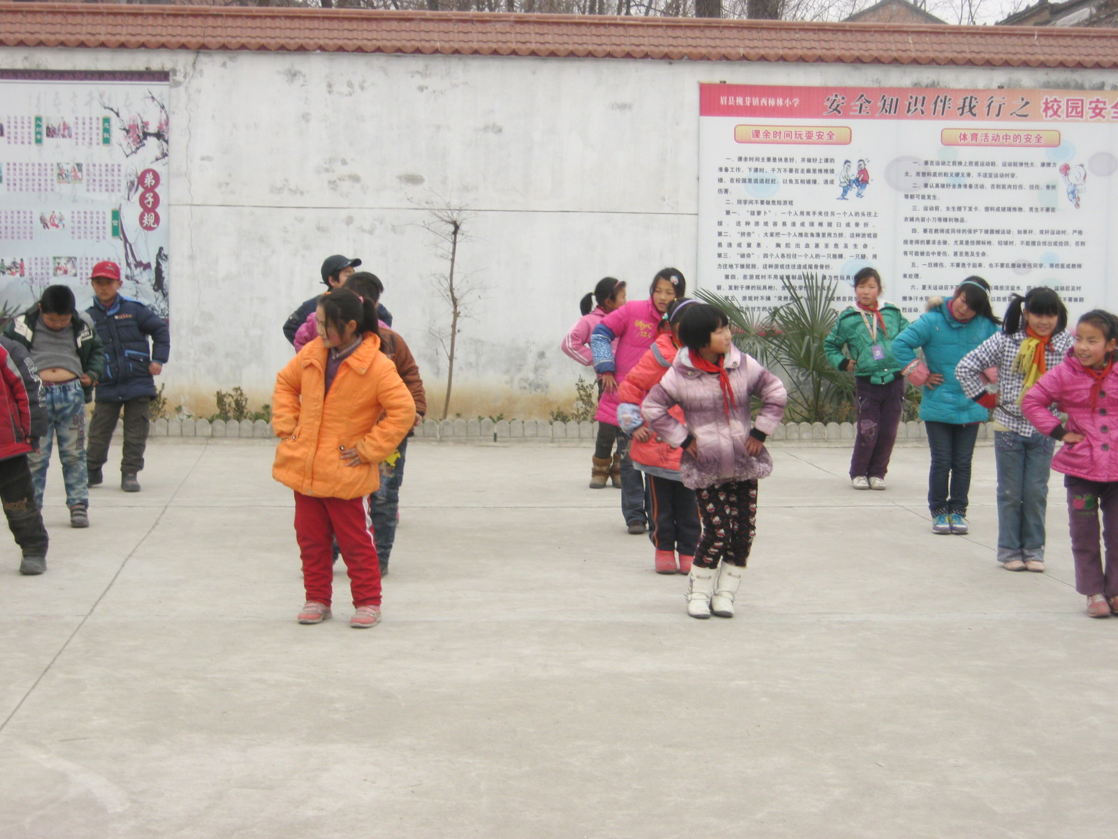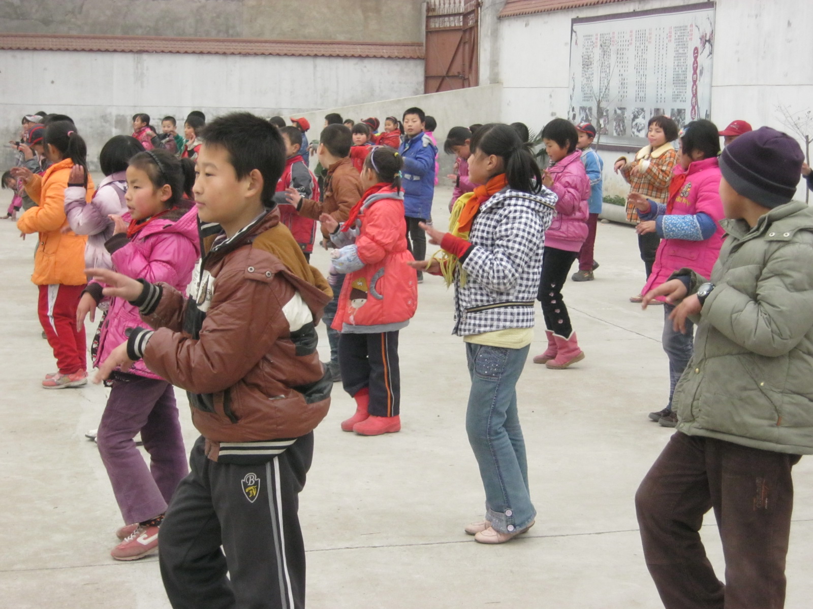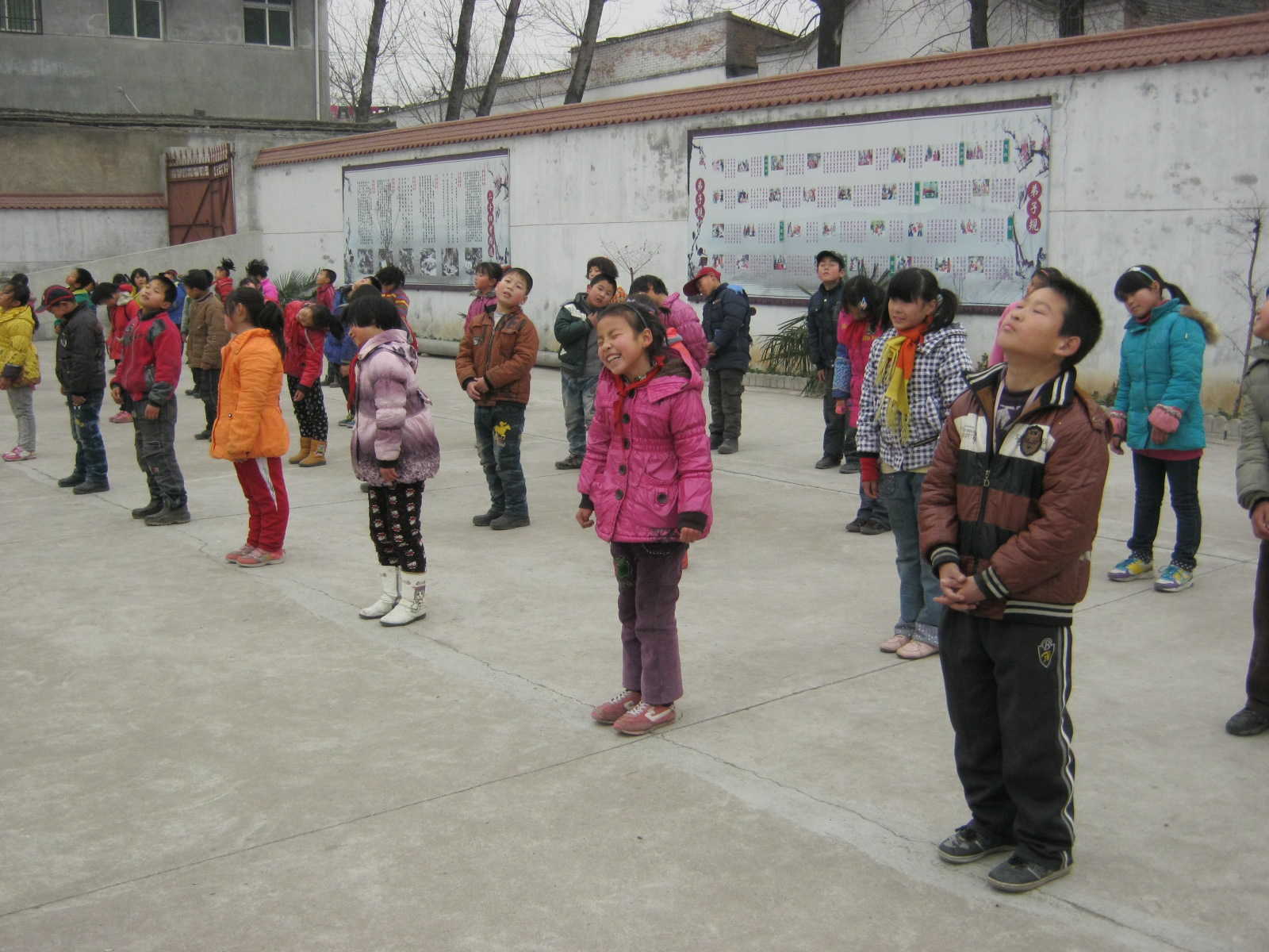 我们接着做了肩部运动,就是双手握拳胸前平屈,肩关节顺时针旋转两周,然后左手上举右手下举向后振,最后交换右臂在上左臂在下。尤其是向后振臂,有好几个同学就是做不来,老师最后给她们耐心的示范和讲解了一遍,她们才勉强通过。