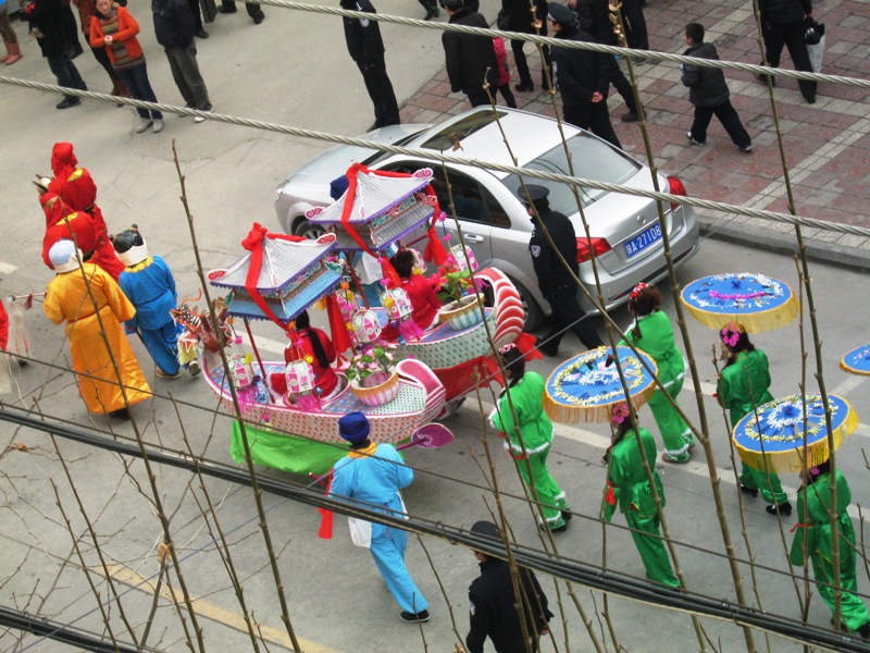 快看快看,那站在最前面的两个人,扮演着两个大头娃娃,甚是可爱。后面是坐在轿子里的官小姐,那精致美丽的花轿一看就是古代有钱人家的女儿所坐的花轿,后面还紧跟着几位穿着碧绿衣服,手上举着蓝油伞的丫环,真是好一幅气派的小姐出游图啊……