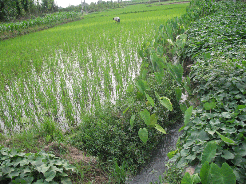 这一条水渠就在我家门前,宽有3、4米左右.里面的水很清澈,可以看到沟地的石头.沟的左边多是竹子,绿荫的树木.装饰着这一条沟.在我们村子上,每一个农家都有一个桥搭在河面上.方便了通知。