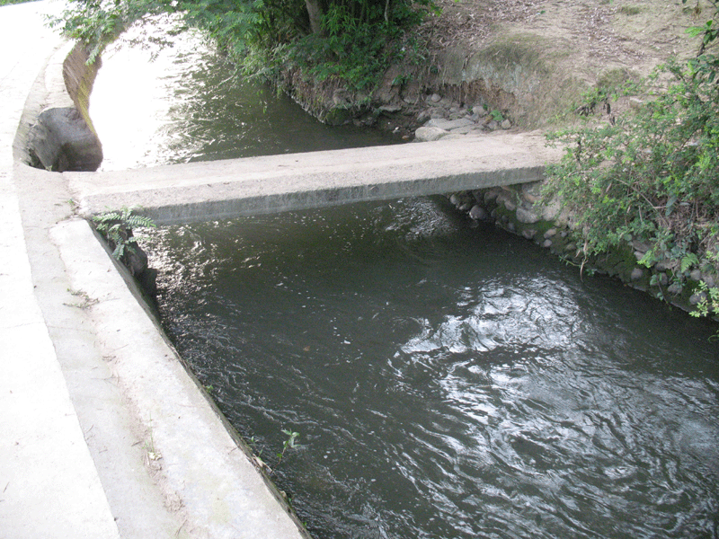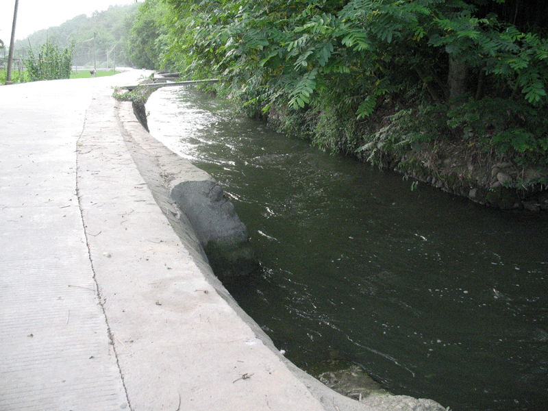 家乡的这一条沟建于50年前,是一条古老的沟.水流很急,原来建了6个泵站.现在由于水利设施的完备,泵站都废了,但在水渠的下游建了一个发电厂.沿着沟渠还修一条水泥路,另一边用石头进行了加固。