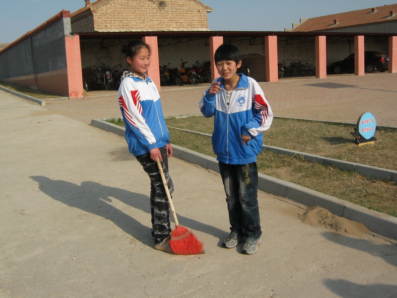 看,这边俩位女同学,一位拿着扫帚,一位在津津有味地说着什么,原来,她是给另一位同学讲故事,把对方都逗乐了,这样的干活,不仅不觉得累,还很轻松呢。