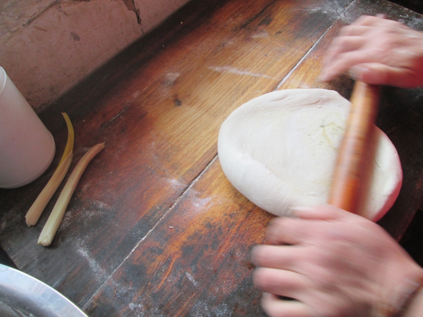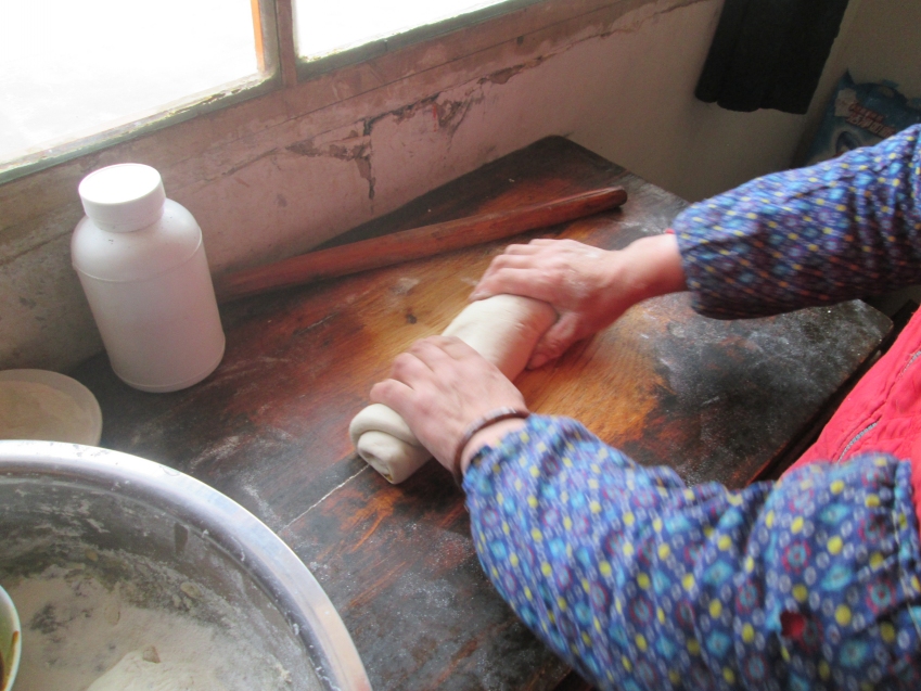 知道了它的来历就让我们制作吧!奶奶告诉我,葱花饼的面不用酵母菌且要硬。还告诉我在制作的过程中要谨慎和面,免得做成了"走水面"。对了哦!千万不能把和好的面揉的光溜溜的哦!因为如果那样会使烙出来的葱花饼咬不下来,影响它的口感,面要刚柔好!