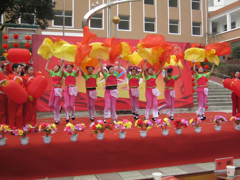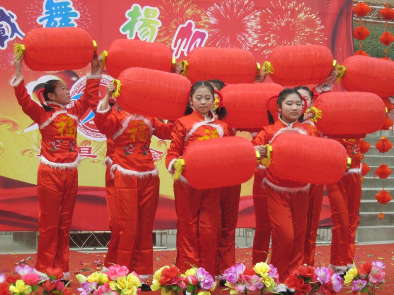 欢快的音乐声响起,一群身穿红色丝绸衣服,手拿大红灯笼,头上用红毛线缠绑着辫子的小姑娘蹦蹦跳跳的上场了,她们一个个脸上洋溢着灿烂的微笑,如同那温暖的阳光照在人们的心房,双手用力的摇摆着火红的灯笼,脚下也不停地变换着动作。瞧那火红的一片,如一团烈焰,让这寒风刺骨的冬天好像变得温暖起来!