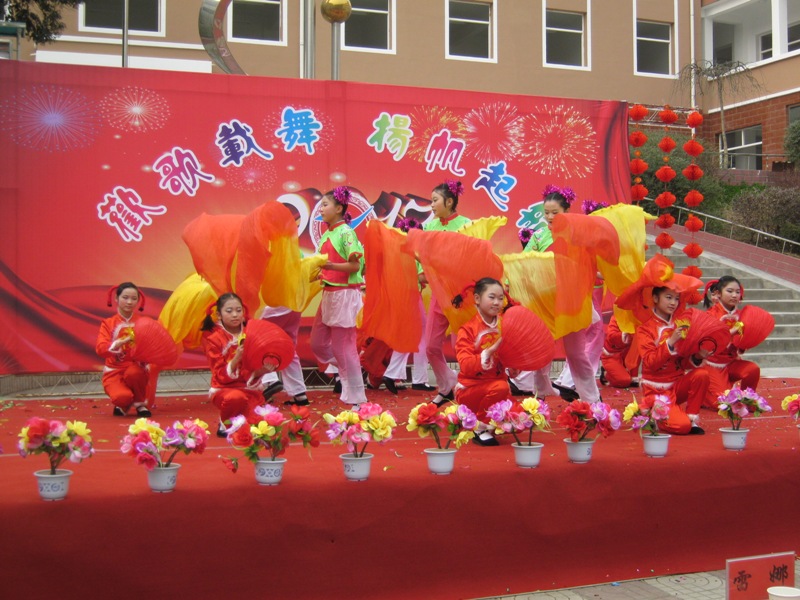 最后一幕,便是拿灯笼的和拿扇子的在一起跳,拿灯笼的围成一个圆圈,拿扇子的便在圆圈中围成一个花的形状,并挥舞着扇子。这个场面就好像是一朵盛开的花朵,向人们吐露着它的芬芳和美丽。坐在台下的观众仿佛感受不到刺骨的寒冷,只专心的看着表演,时不时的为台上跳舞的人鼓掌喝彩。舞曲结束,我们的表演也完美落幕。台下更是一片雷鸣般的掌声,这无疑是给我们最大的欣慰。
