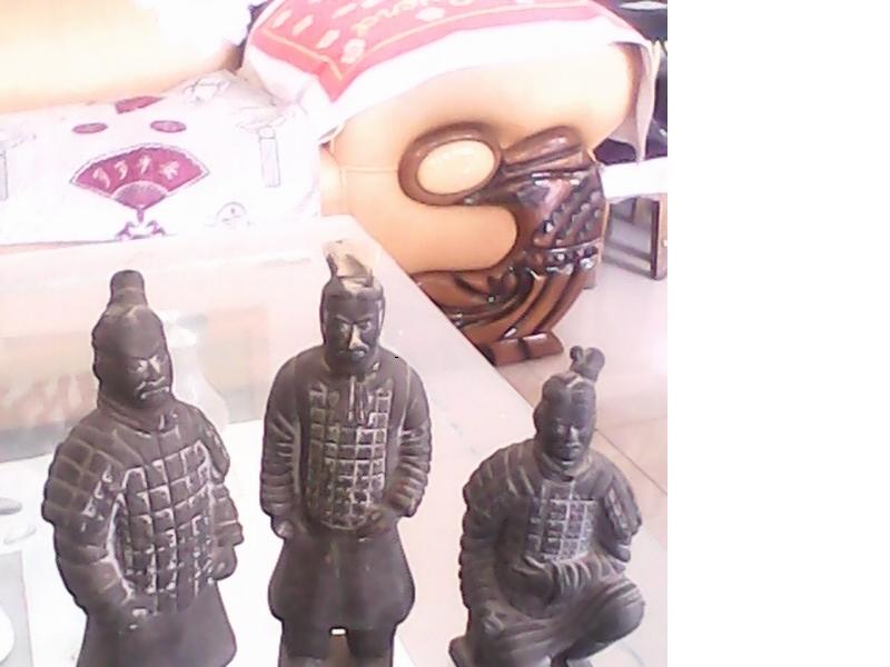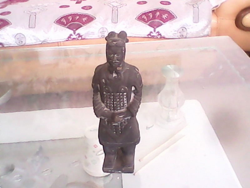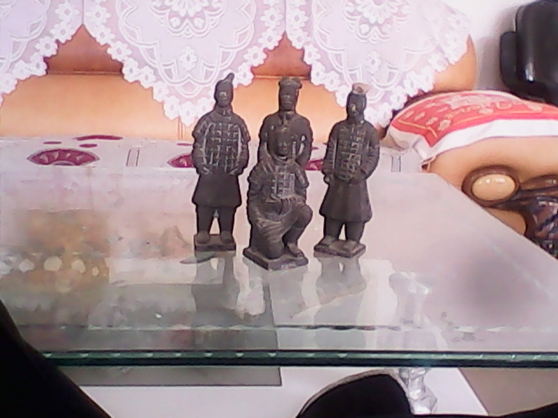 我家的兵马俑虽没有俑坑中兵马俑的壮观,但气势丝毫不比俑坑中的差。这个战队由三个士兵、一个将军和一匹战马组成,是用黑色陶泥烧制而成。战队中的士兵和将军高大威武,战马膘肥体壮。但是,由于年代长久,战马在一次拆迁中丢失了。尽管如此,整个战队仍给人一种压抑的感觉。