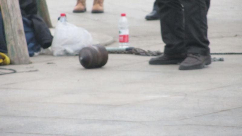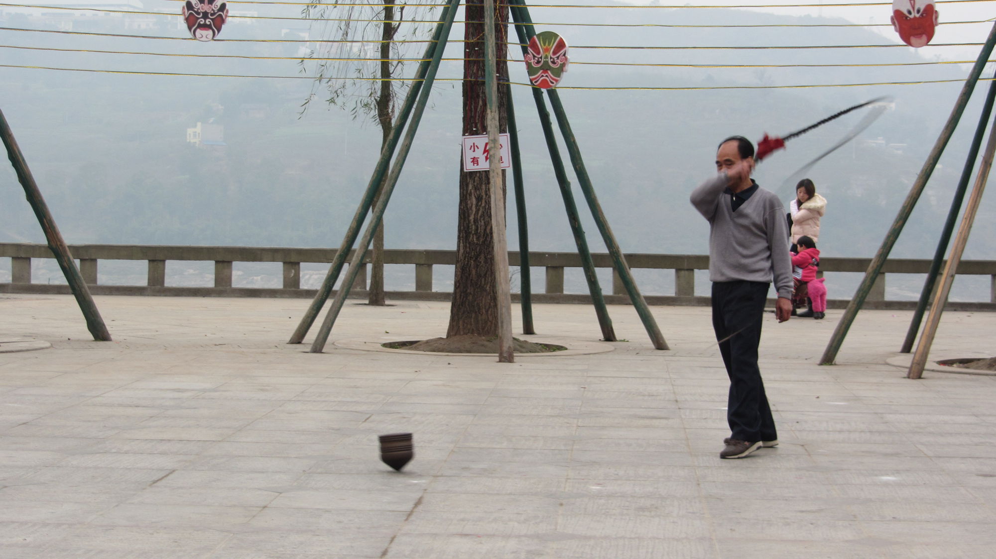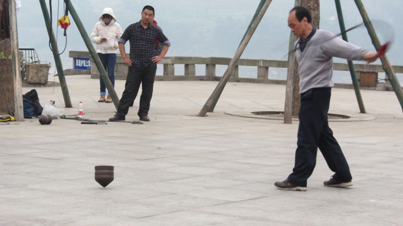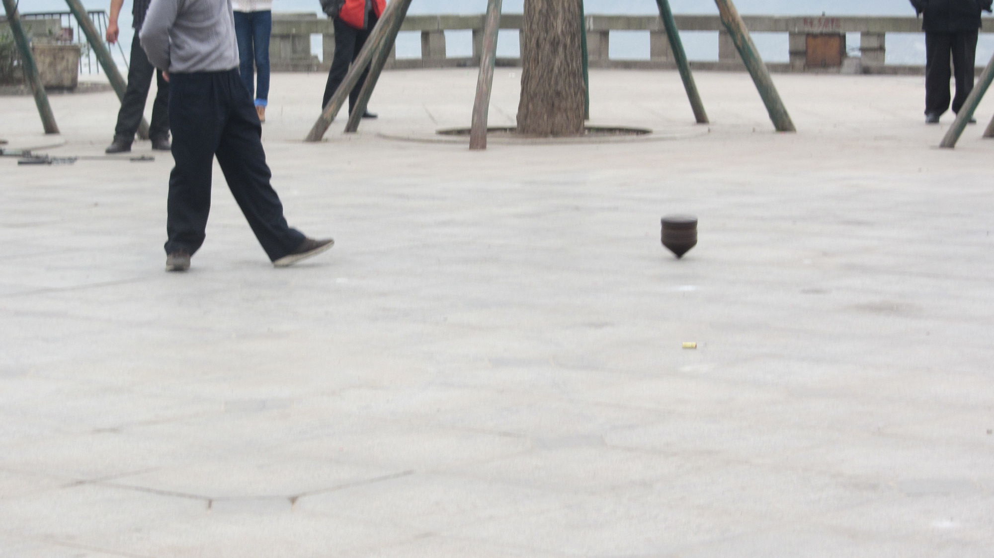 终于看清楚了,原来是有人在抽陀螺,不过,这可不是小孩子玩的那种陀螺,好像是用木头做成的,比小朋友玩的陀螺大很多,一看就是很重的样子,这样的陀螺得用多大的鞭子抽啊,果然,那条鞭子是皮革做成,几乎两米长,我还是第一次看见这个型号的陀螺和鞭子,顿时我对抽陀螺的人充满了好奇:这一定是个"重量级"人物!