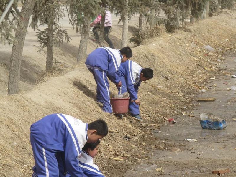 我们班的任务是清理校门前路边的树槽和黑山沟一带。班主任给小组长分配好任务后,小组长便带领他的组员开始行动了。这是我们小组的人员在清理树槽垃圾,树槽垃圾零碎而杂乱,同学们细心地进行清理,不一会儿,已经清理了一大袋垃圾了。