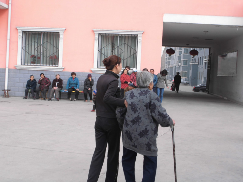 有一位老奶奶在工作人员的搀扶下慢慢在院中散步,这种和谐的场面让人看了心中觉得异常温暖。让我联想到,我们每个人能否在社会生活中,也做到关心老人,爱护老人呢?
