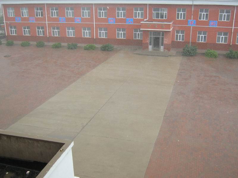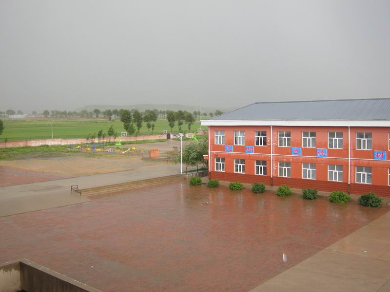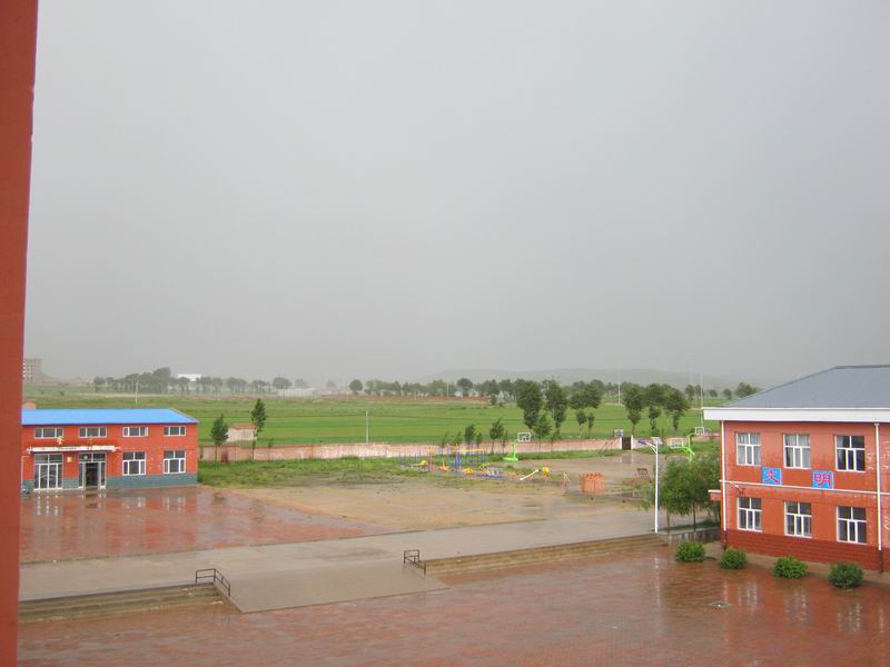 开始补课了,雨越下越大,只能听到"沙沙"的响声。过了一会,雨停了。孩子们从教学楼里跑出来。在水中嬉戏打闹。水花四溅,像一个个调皮的娃娃。